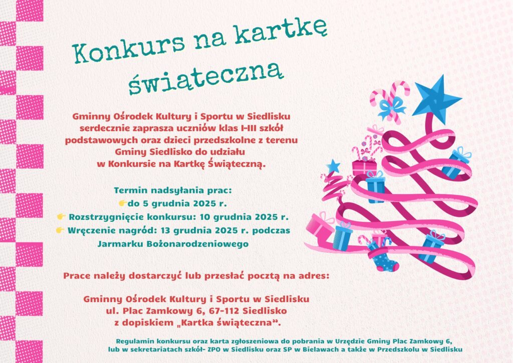 Gminny Ośrodek Kultury i Sportu w Siedlisku zaprasza uczniów klas I-III szkół podstawowych oraz dzieci przedszkolne z terenu Gminy Siedlisko do udziału w Konkursie na Kartkę Świąteczną! 🎨✨