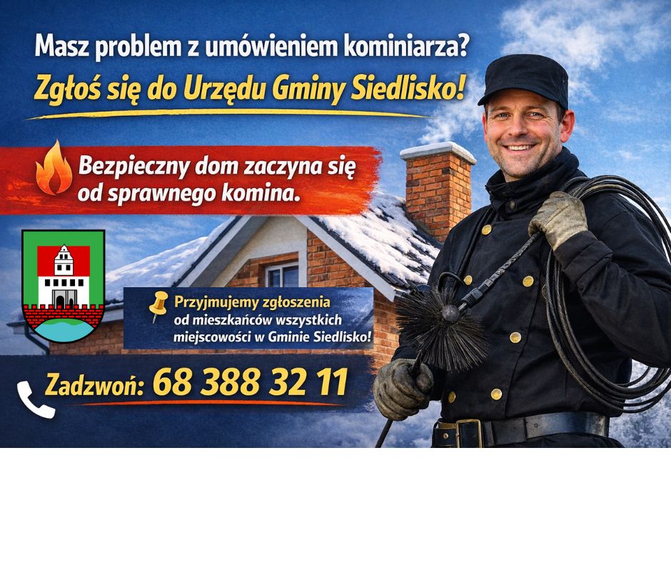 Wychodząc naprzeciw oczekiwaniom mieszkańców, Urząd Gminy Siedlisko – po rozmowach z kominiarzem obsługującym nasz rejon – przyjmuje zgłoszenia mieszkańców chętnych do skorzystania z usług kominiarskich.