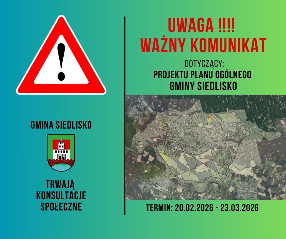 W dniu 9 marca 2026 r. o godz. 16:00 w Urzędzie Gminy Siedlisko odbyło się spotkanie otwarte w ramach konsultacji społecznych projektu Planu Ogólnego Gminy Siedlisko.