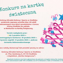 Gminny Ośrodek Kultury i Sportu w Siedlisku zaprasza uczniów klas I-III szkół podstawowych oraz dzieci przedszkolne z terenu Gminy Siedlisko do udziału w Konkursie na Kartkę Świąteczną! 🎨✨ 🔔 Terminy: 🎁 Prace należy dostarczyć lub wysłać pocztą na adres:Gminny Ośrodek Kultury i Sportu w Siedliskuul. Plac Zamkowy 6, 67-112 Siedliskoz dopiskiem “Kartka Świąteczna” Więcej informacji, Read more about 🎄 Konkurs na Kartkę Świąteczną! 🎄[…]