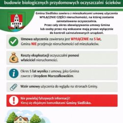✅ Gmina Siedlisko zawiera z mieszkańcami umowę użyczenia WYŁĄCZNIE CZĘŚCI nieruchomości, na której zostanie zainstalowana oczyszczalnia.✅ Umowa użyczenia zawierana jest na okres 5 lat, liczonych od dnia otrzymania przez Gminę Siedlisko wypłaty pomocy.✅ Przez cały okres obowiązywania umowy Gmina lub osoby przez nią wskazane mają prawo wyłącznie do kontroli zainstalowanych urządzeń.❗ Gmina nie przejmuje nieruchomości, Read more about 📢 WAŻNA INFORMACJA – dementujemy plotki w związku z pojawiającymi się nieprawdziwymi informacjami dotyczącymi realizacji zadania polegającego na budowie biologicznych przydomowych oczyszczalni ścieków[…]